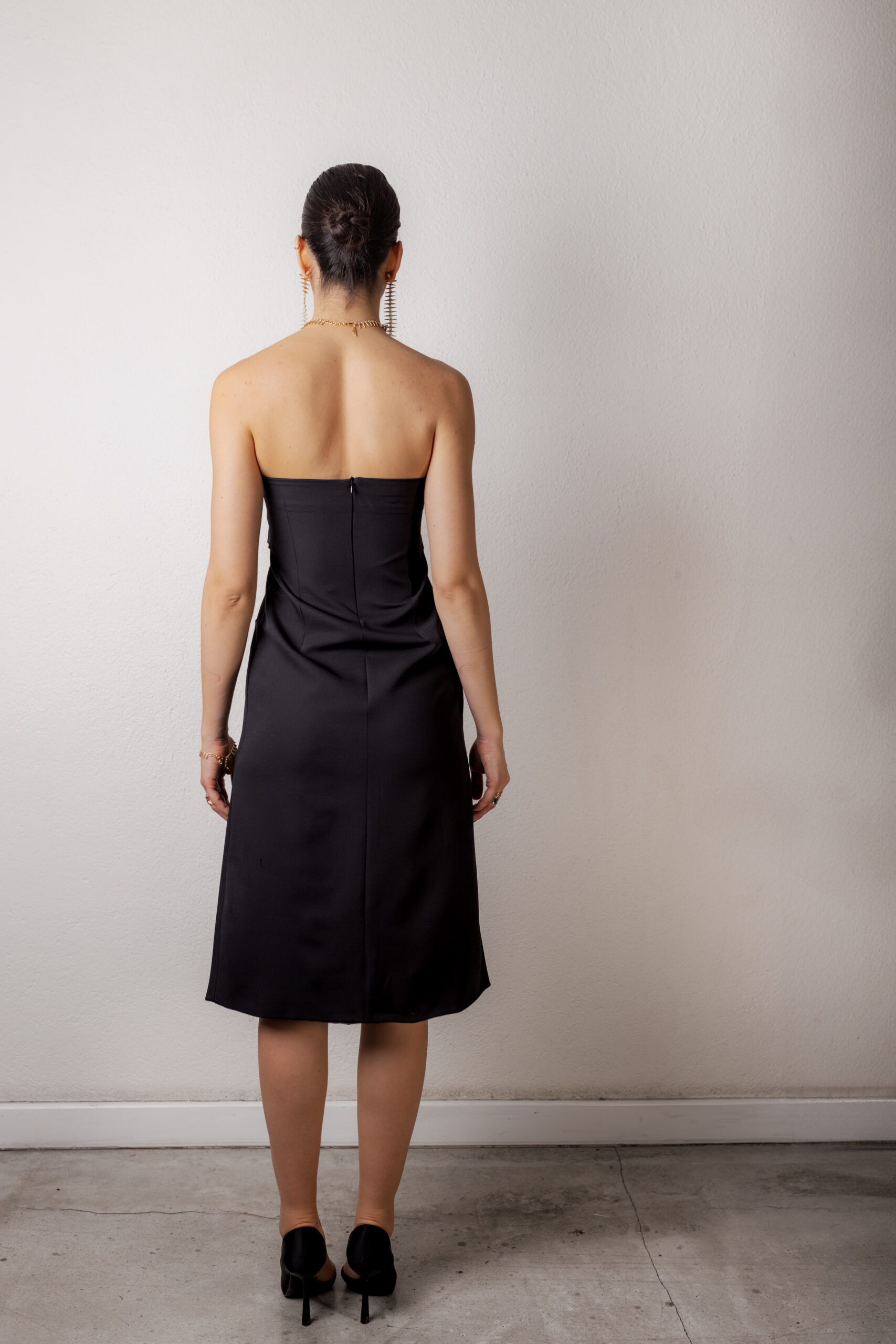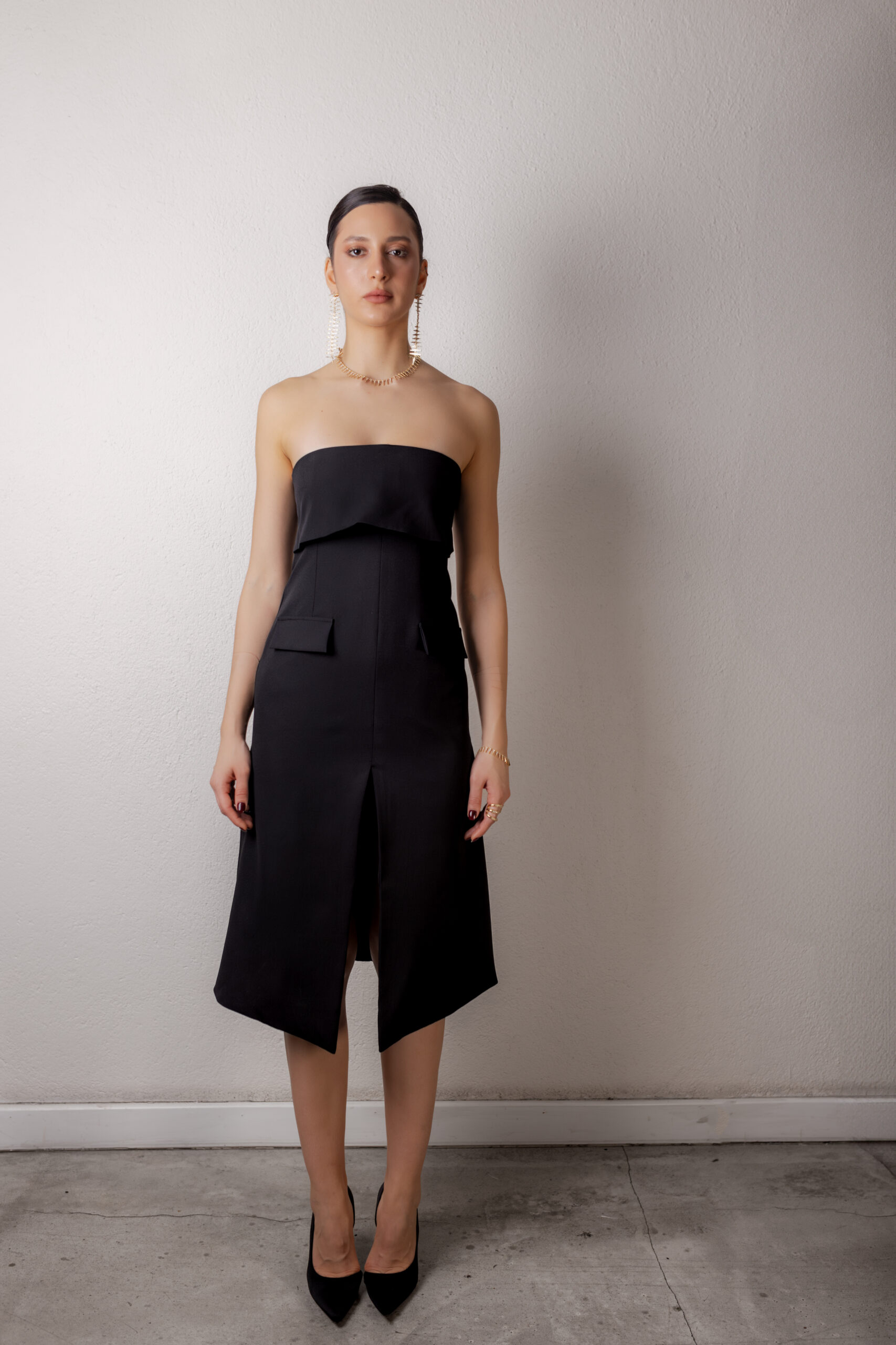 Straplez formu, vücudu nazikçe saran yapısı ve ön yırtmaç detayıyla feminen gücü öne çıkarır. Takılıp çıkarılabilen eldiven formundaki kolları sayesinde görünümü kolayca dönüştürür; sade bir siluetten daha iddialı bir stile geçiş sunar. Mimari kesimiyle duruşu net, hissi güçlüdür.